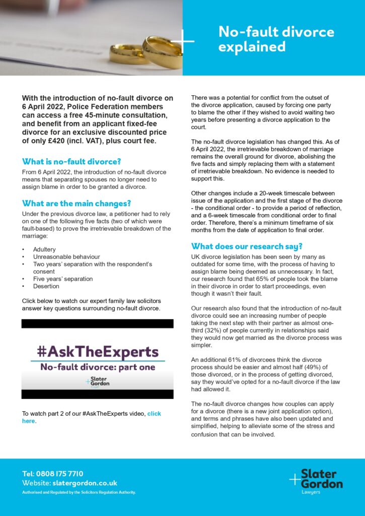 With the introduction of no-fault divorce on 6 April 2022, Police Federation members can access a free 45-minute consultation, and benefit from an applicant fixed-fee divorce for an exclusive discounted price of only £420 (incl. VAT), plus court fee.